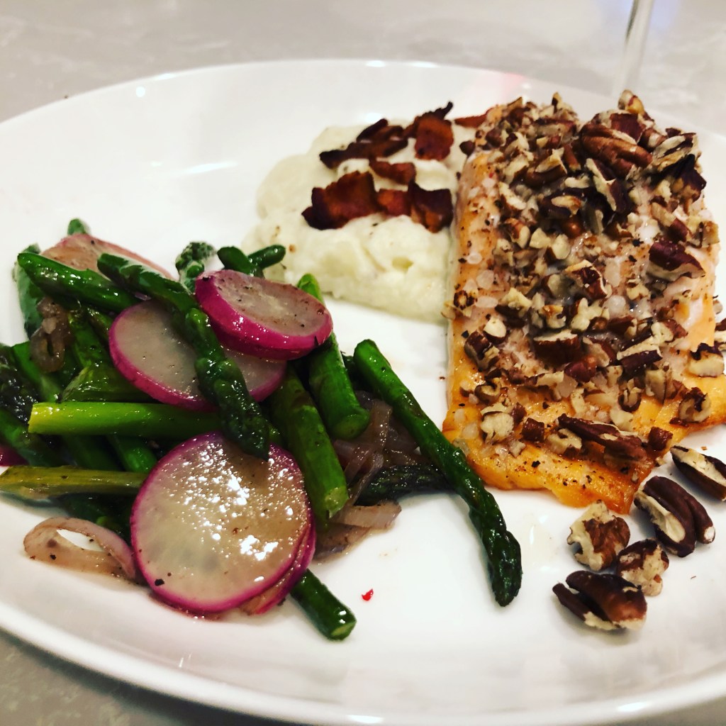 I had a request from my lovely sister to give her something with no carb/no sugar which is something I do love to do so I stepped it up! My friend Jen was coming over for dinner so I thought why not make Pecan Crusted Salmon with bacon cauliflower purée and an asparagus, radish and shallot sauté which was divine if I say so myself. Please don’t ask me where I came up with the menu, these things just come to me in my sleep; it is kind of ridiculous how obsessive I am about food…