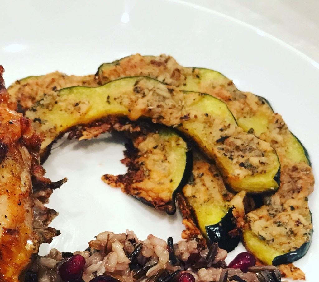 So this is a super easy and healthy recipe that is a good accompaniment to almost any protein (except maybe fish but hey, its your food so make it your own!). Don’t stress that you missed a step here, you don’t peel the squash because the skin is perfectly edible and delicious just make sure to wash it really well before you cut it.