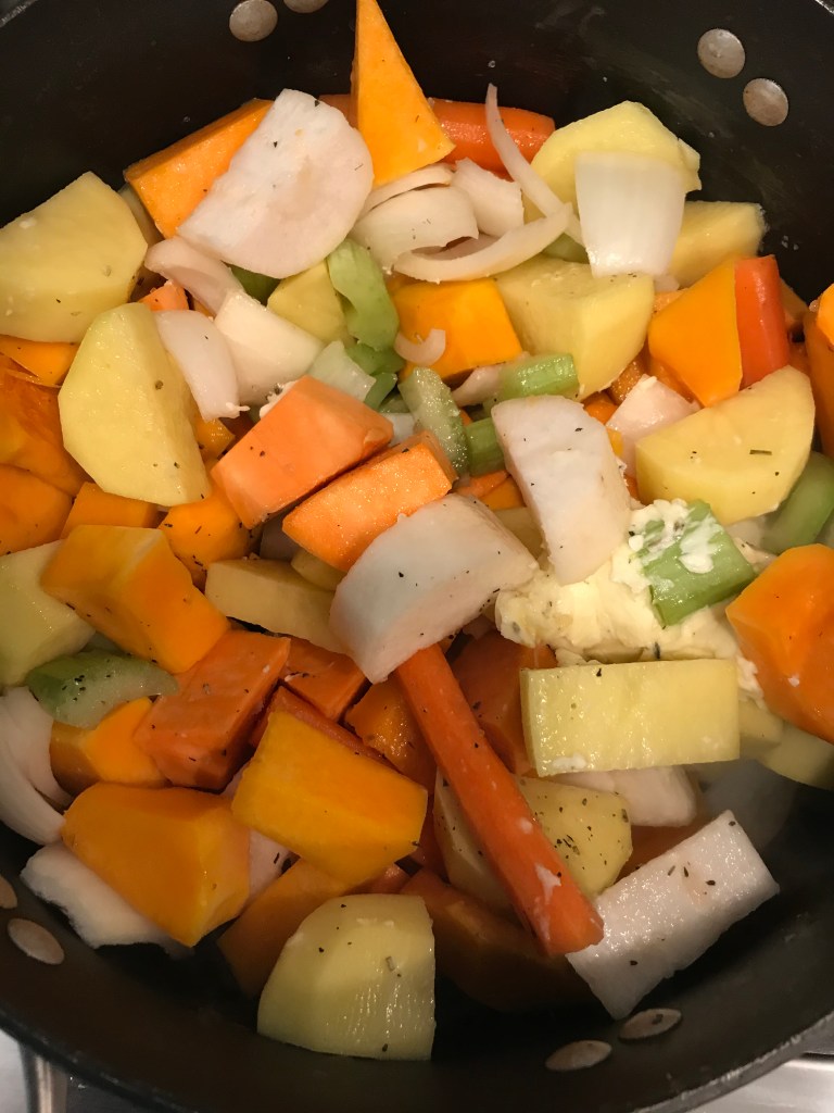 You don’t have to worry about size so much as consistency. Here are my vegetables in the pot, they will be blended so the size isn’t an issue as long as they are all about the same size for cooking time.