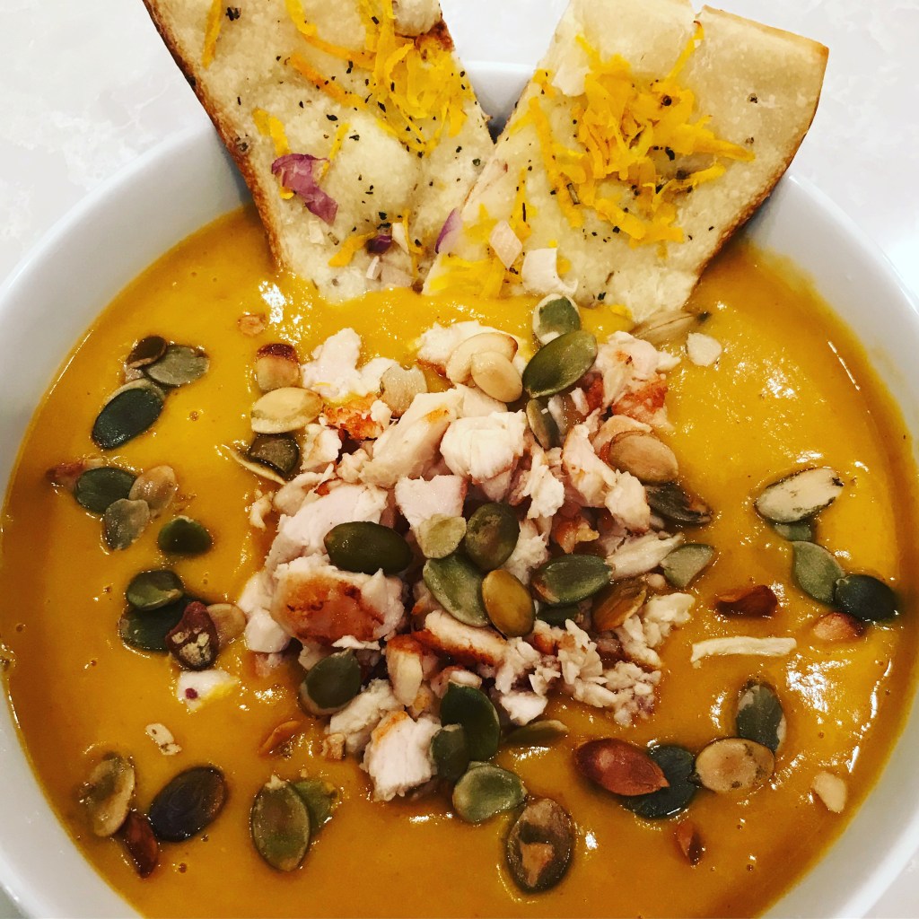 After I put it in the bowls, I added some crisped up leftover chicken breast and pumpkin seeds. You can add anything to the bowl that you like to give it some texture, some are good suggestions: